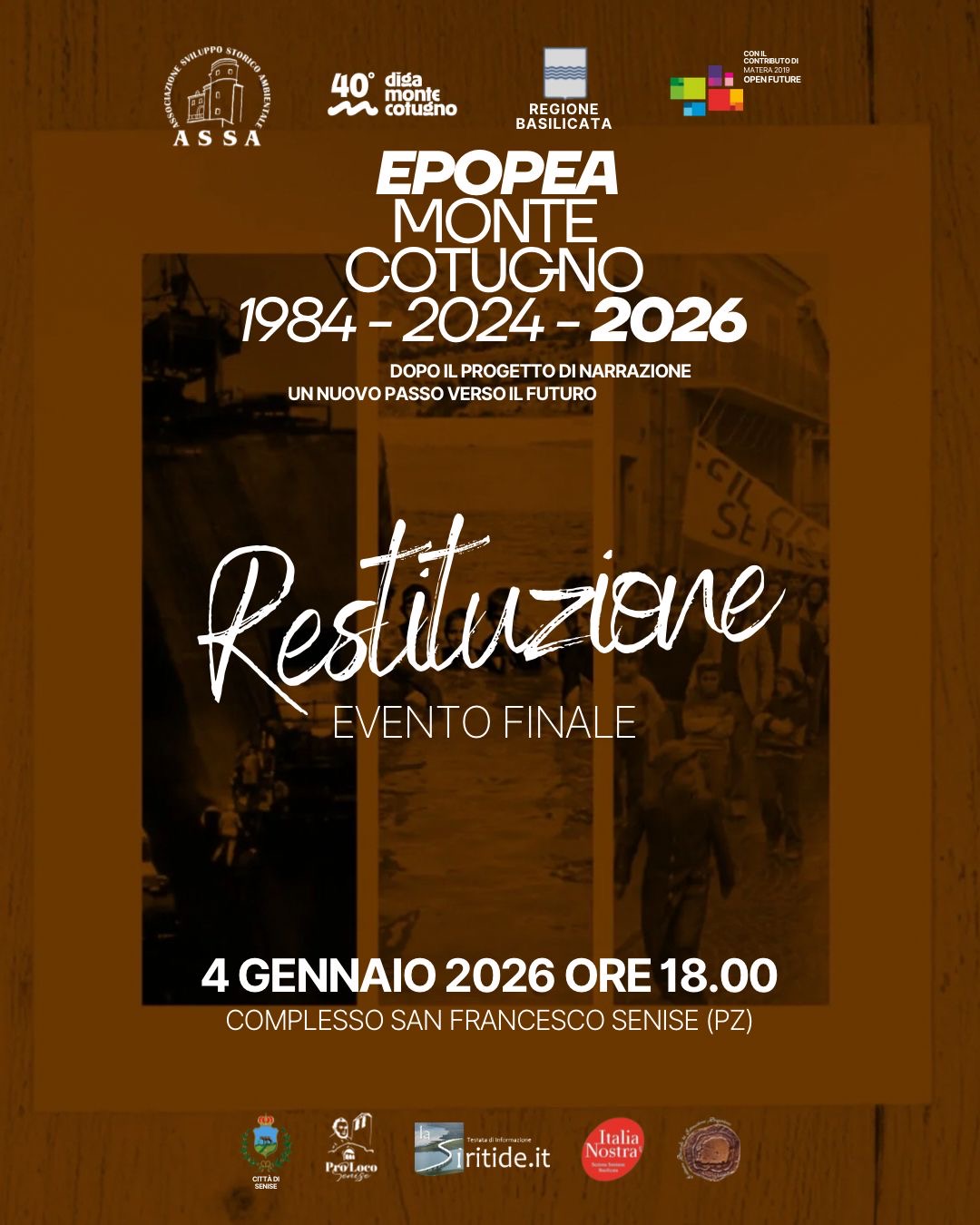 Venerdì 4 gennaio, alle ore 18.00, il Complesso San Francesco di Senise ospiterà l’evento conclusivo del progetto Epopea Monte Cotugno, un momento di restituzione e confronto aperto alla comunità.